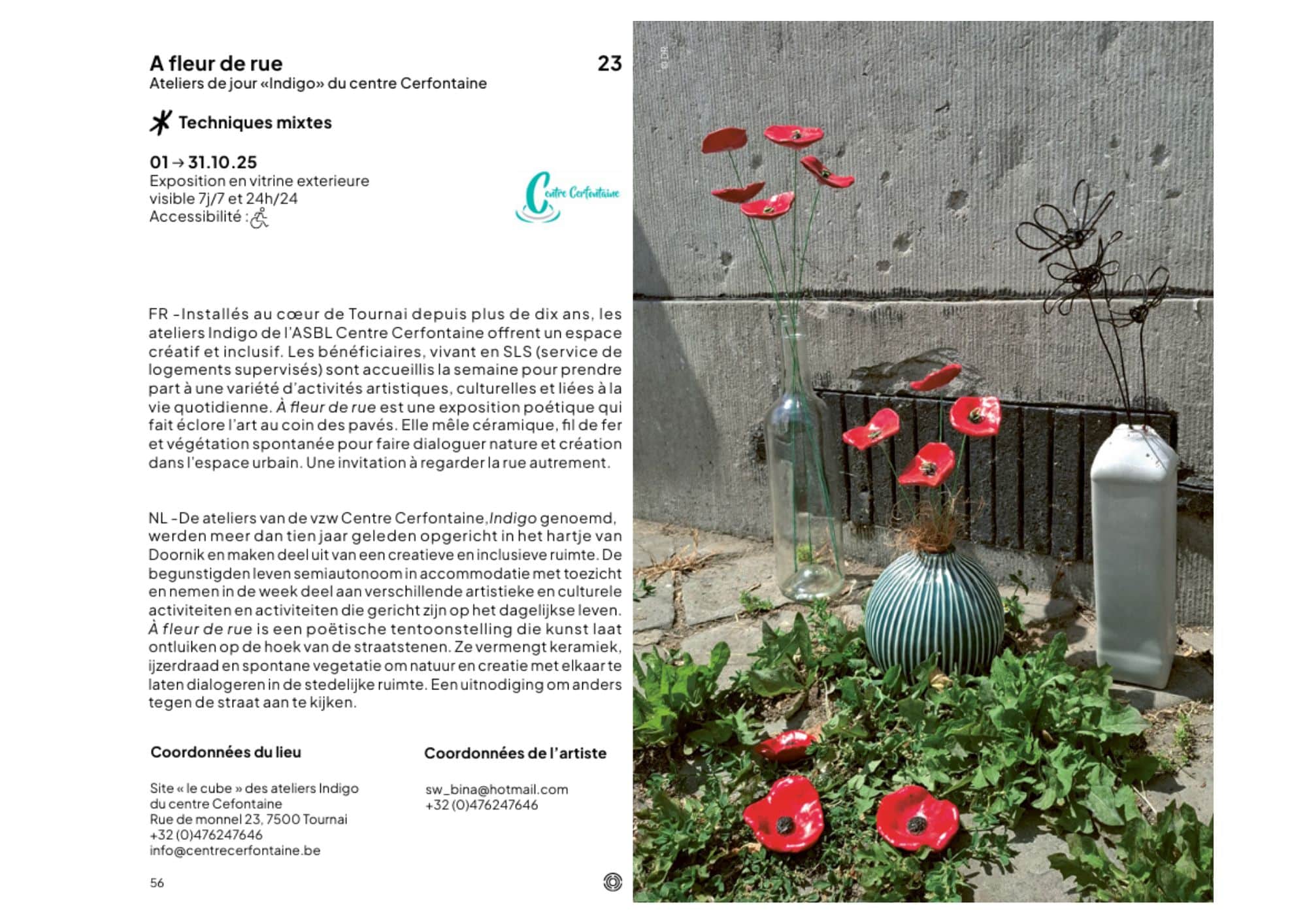 Et si la vitrine vous attire, n’hésitez pas à pousser la porte ! Nous serons ravis de vous accueillir, d’échanger avec vous, et de vous remettre le livret officiel des parcours (https://www.tournai.be/arts-dans-la-ville-2025).